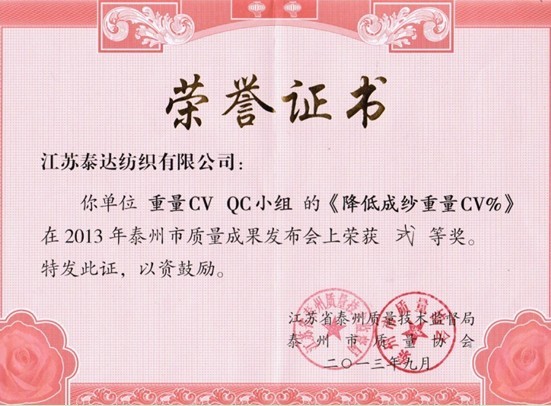 同時,公司QC小組攜此課題參加了2013年“泰州移動杯”QC小組質量成果大賽并最終入選。2013年9月26日,泰州市質量技術監督局特邀有關領導和專家擔任評委,對各企業入選成果進行評審。最終,我公司“降低成紗重量CV%”QC小組榮獲二等獎,這是姜堰區入選企業榮獲的最高名次,亦是泰州全市、區范圍內紡織企業獲獎的最高名次。